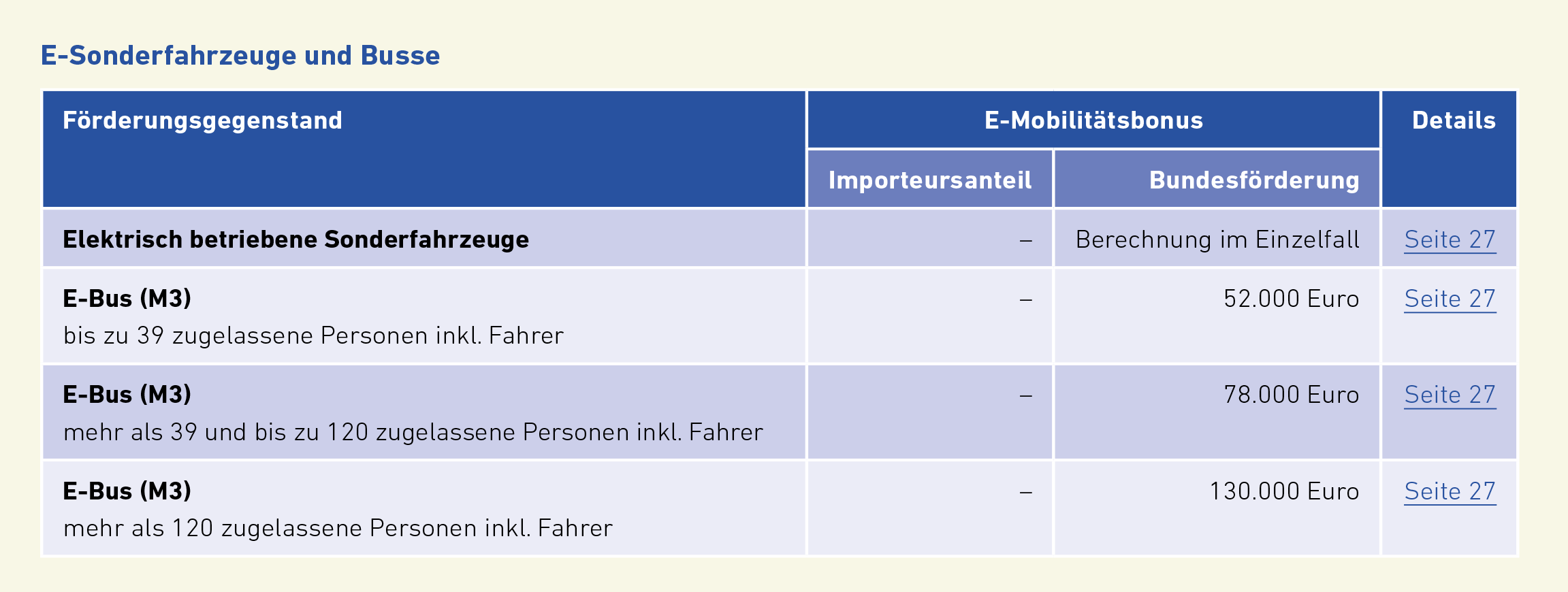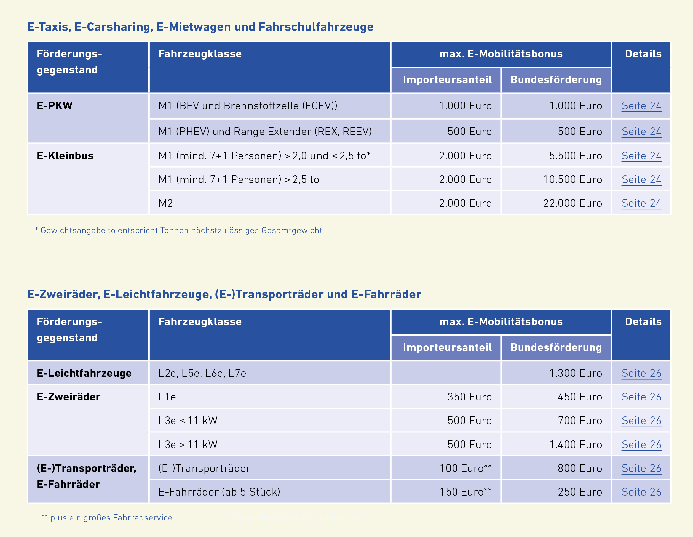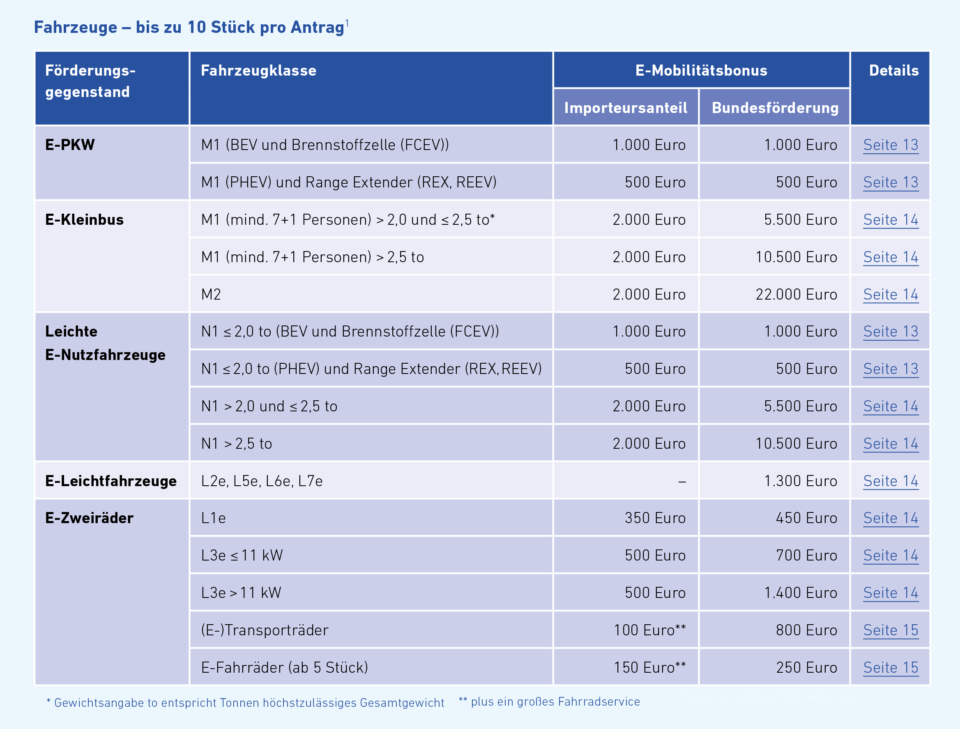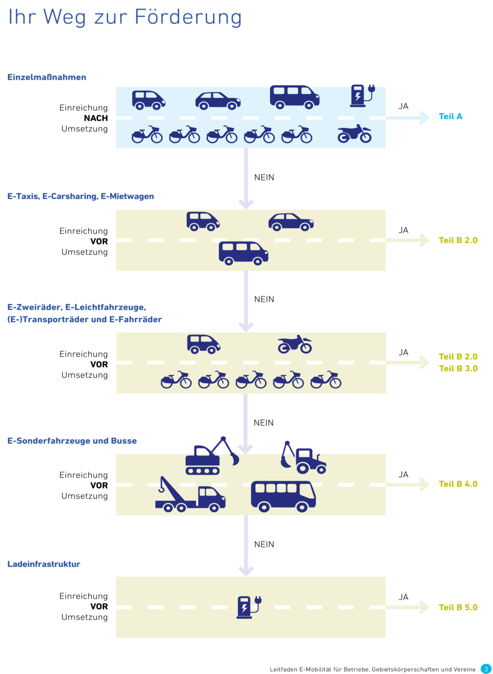 Darüber hinaus können leichte E-Nutzfahrzeuge, E-Busse, E-Sonderfahrzeuge gefördert werden (Teil B des Leitfadens). Der Antrag dafür wird VOR Umsetzung der Maßnahme gestellt. Eine Übersicht über alle Förderangebote, die VOR Umsetzung der Maßnahme beantragt werden können, finden Sie in nachfolgender Grafik sowie auch auf Seite 6 und 7 des Leitfadens.