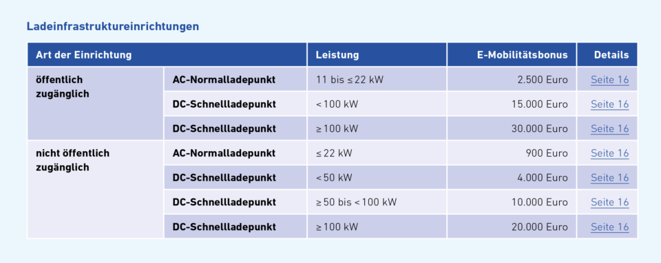 Gefördert werden können E-Fahrzeuge und Ladeinfrastruktureinrichtungen (Teil A des Leitfadens). Der Antrag dafür wird nach Umsetzung der Maßnahme gestellt. Eine Übersicht über alle Förderangebote, die NACH Umsetzung der Maßnahme beantragt werden können, finden Sie in nachfolgender Grafik sowie auch auf Seite 4 und 5 des Leitfadens.