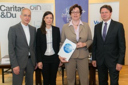v.l.n.r.: Michael Landau, Präsident Caritas Österreich und Projektpartner; Anja Christanell, Geschäftsführerin Österreichisches Institut für Nachhaltige Entwicklung (ÖIN) und Projektleiterin; Theresia Vogel, Geschäftsführerin des Klima- und Energiefonds; Wolfgang Anzengruber, Vorstandsvorsitzender Verbund AG und Projektpartner „VERBUND Stromhilfefonds“.