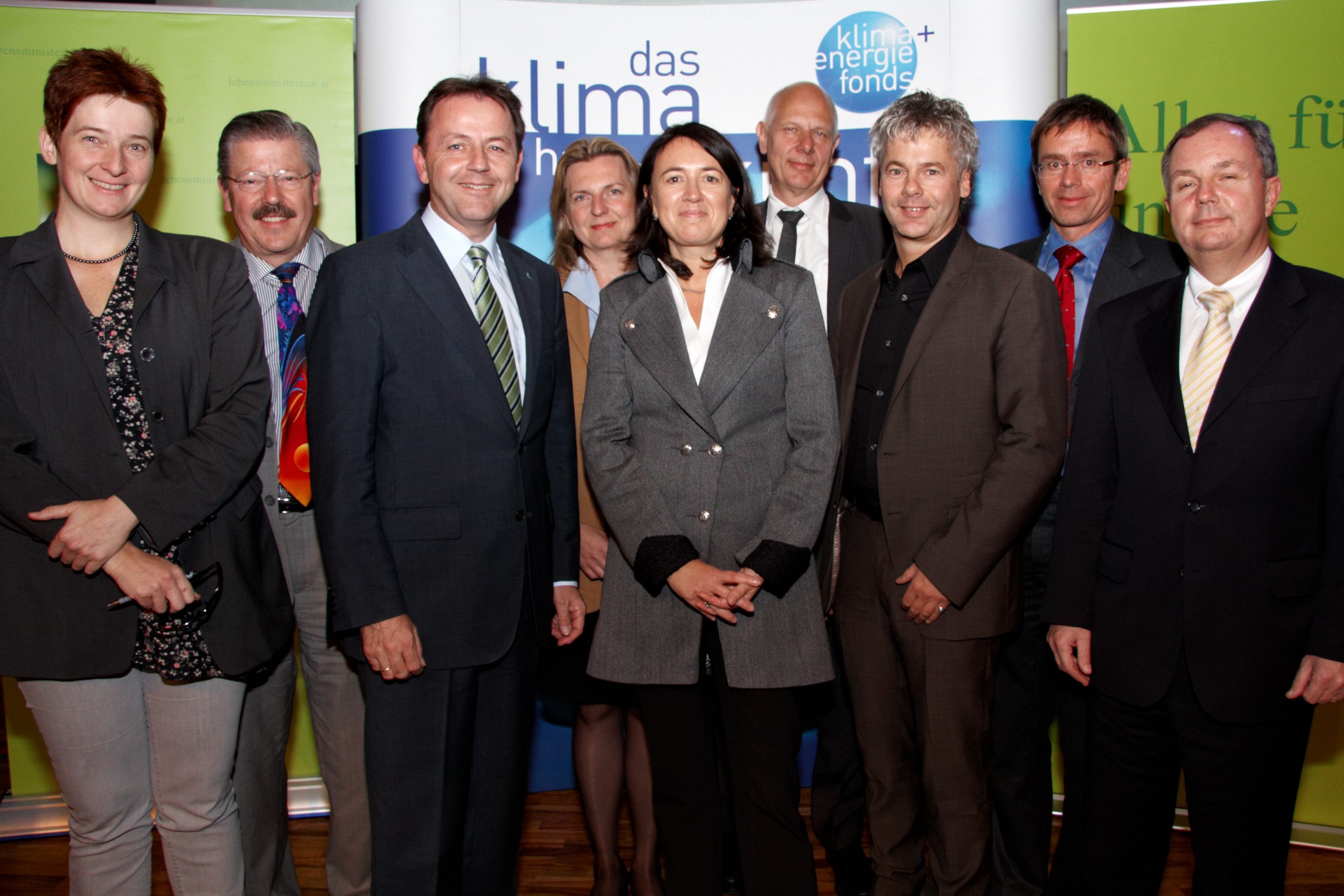 • Die Zukunft der Erneuerbaren Energie - im Bild v.l.n.r. Sigrid Stagl (Professorin an der Wirtschaftsuniversität Wien), Winfried Hoffmann (Vice President EPIA, CTO von Applied Materials), Bundesminister Nikolaus Berlakovich, Karin Kneissl (Journalistin), Monika Langthaler (Moderation, Geschäftsführerin brainbows), Matthias Horx (Zukunftsforscher), Ingmar Höbarth (Geschäftsführer Klima- und Energiefonds), Stefan Rahmstorf (Professor für pysikalische Ozeanographie) und Joachim Buse (Leiter Projekt Aviation Biofuel, Lufthansa)