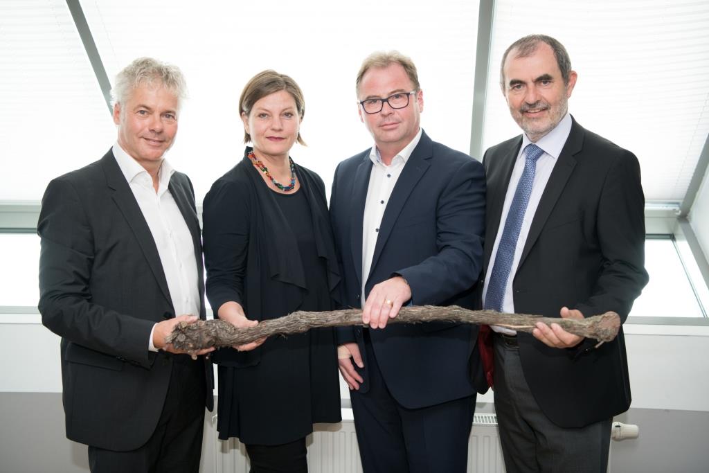 Bild mit Österreichkarte v.l.n.r.: Ingmar Höbarth, Geschäftsführer Klima- und Energiefonds; Josef Plank, Generalsekretär Bundesministerium für Nachhaltigkeit und Tourismus; Reinhard Indraczek, Mitglied des Projektteams der KLAR! Pulkautal und Monika Mörth, Geschäftsführerin Umweltbundesamt.
