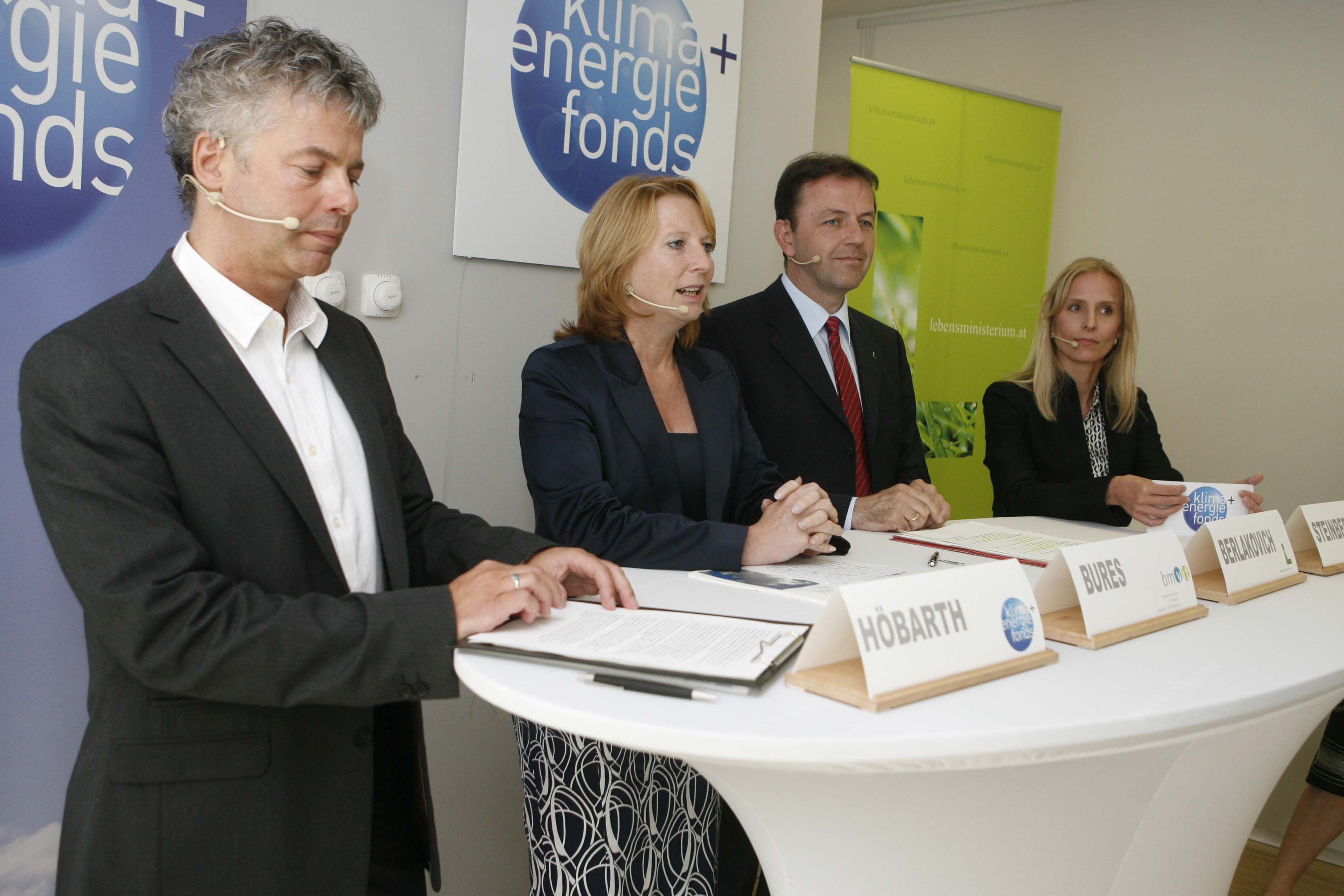 • Klima- und Energiefonds neu - Präsentation der Schwerpunkte 2009. v.l.n.r.: Ingmar Höbarth (GF Klima- und Energiefonds), Doris Bures (Infrastrukturministerin), Niki Berlakovich (Umweltminister), Eveline Steinberger (GF Klima- und Energiefonds). APA-OTS FOTO: Robert Strasser