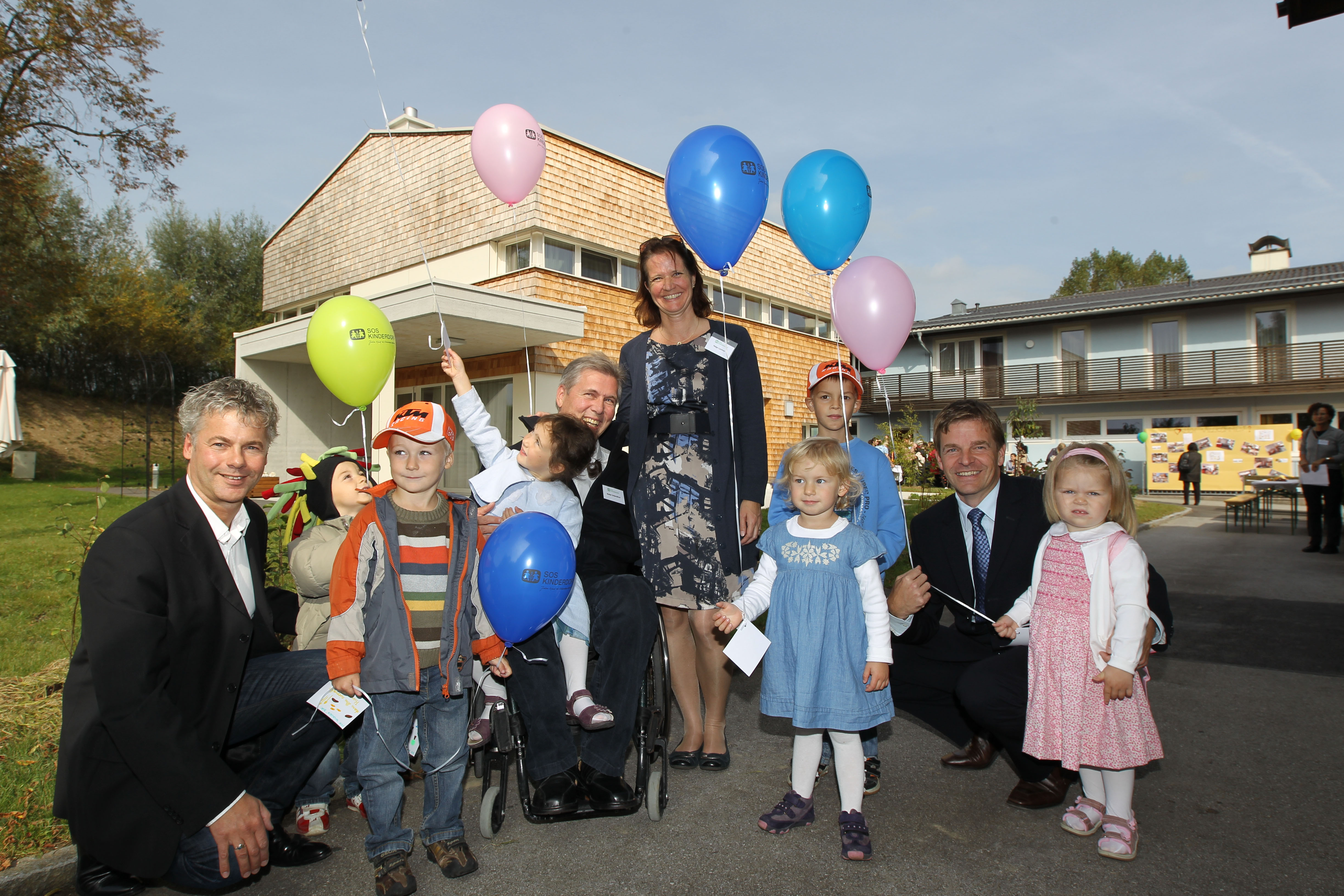 HAUS "SONNENSCHEIN" IM SOS KINDERDORF SEEKIRCHEN ERÖFFNET.In Seekirchen bei Salzburg wurde heute mit Unterstützung des Klima- und Energiefonds das "Haus Sonnenschein" im Kinderdorf eröffnet. Das liebevolle Zuhause ist barrierefrei und besonders energiesparend. Im Bild mit den Kinderdorfkindern v.l. Ingmar Höbarth vom Klima- und Energiefonds, die Kinderdorfeltern Helga Lechner und Walter Untermährer sowie Christian Moser, Geschäftsführer der SOS Kinderdörfer. Foto: APA/OTS/Franz Neumayr 30.9.2010
