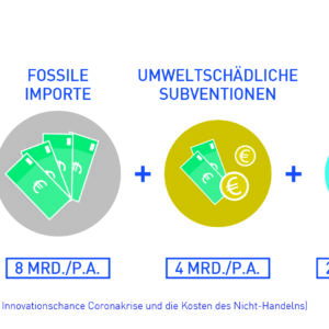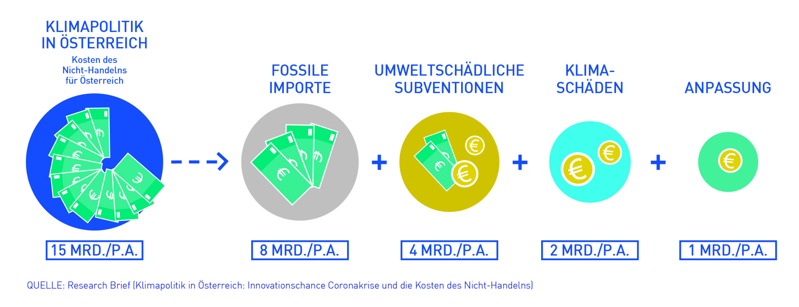 Verursacht werden diese Kosten durch Wertschöpfungsverluste für fossile Importe (8 Mrd. Euro), umweltschädliche Förderungen (4 Mrd. Euro), wetter- und klimabedingte Schäden (2 Mrd. Euro) und Klimawandelanpassung (1 Mrd. Euro).