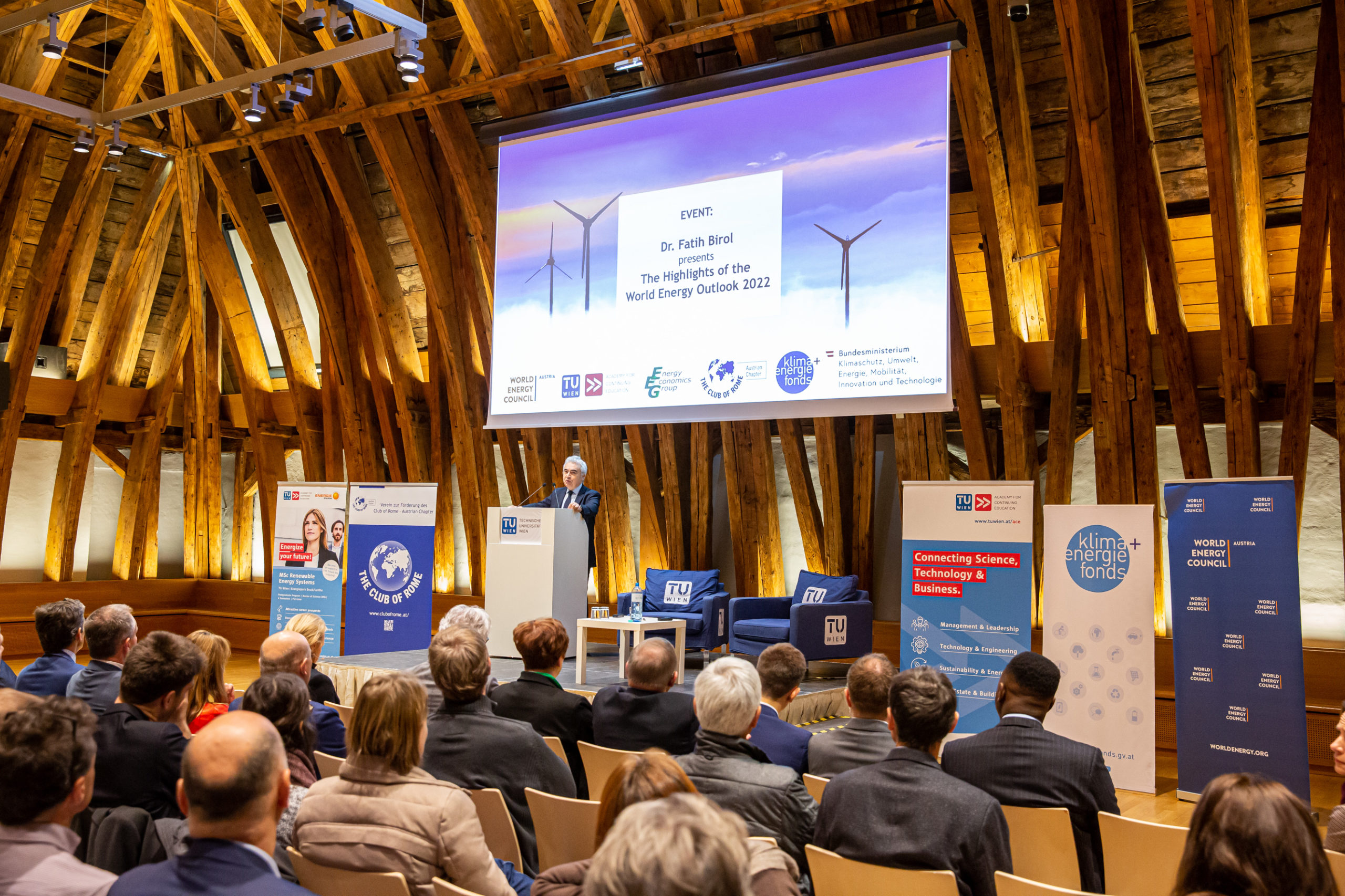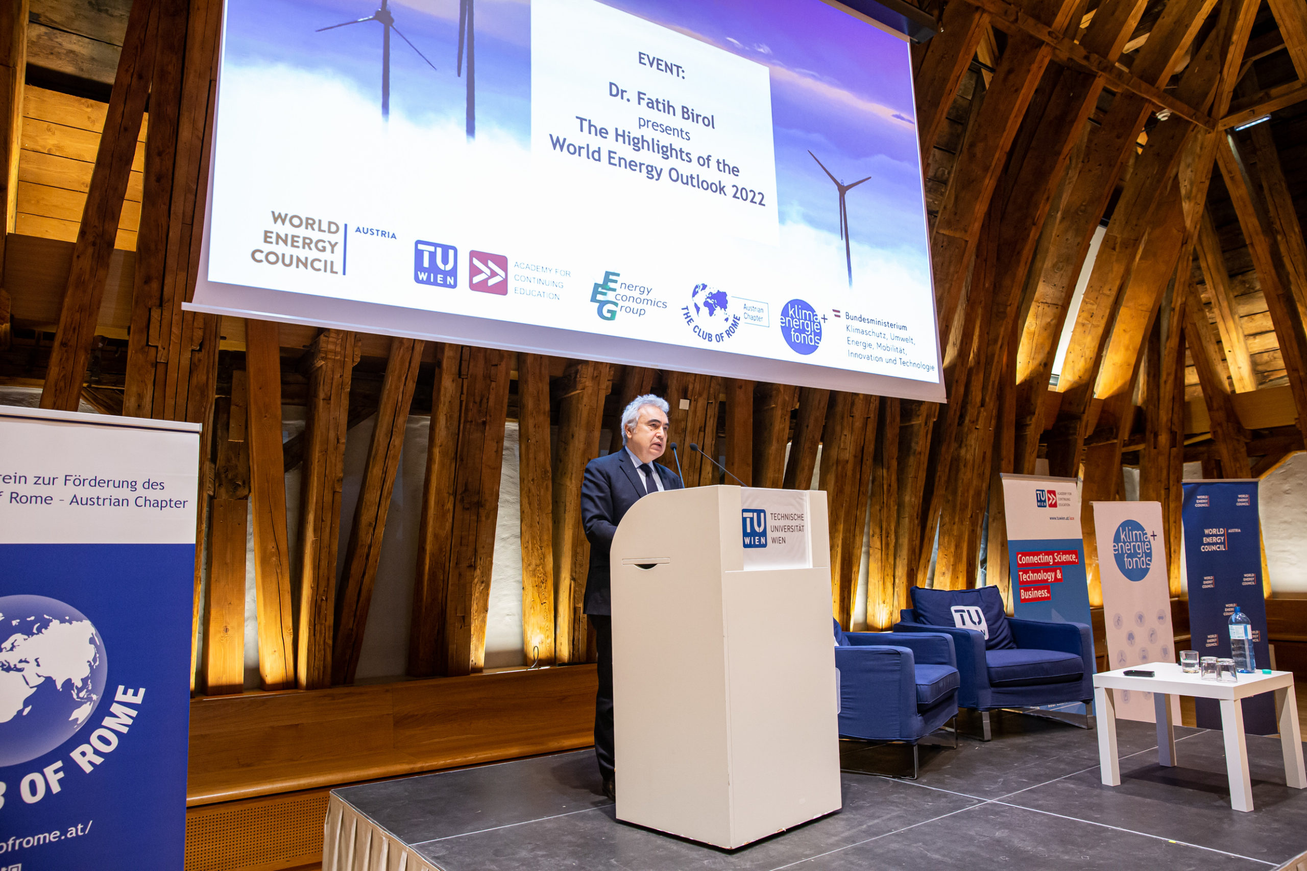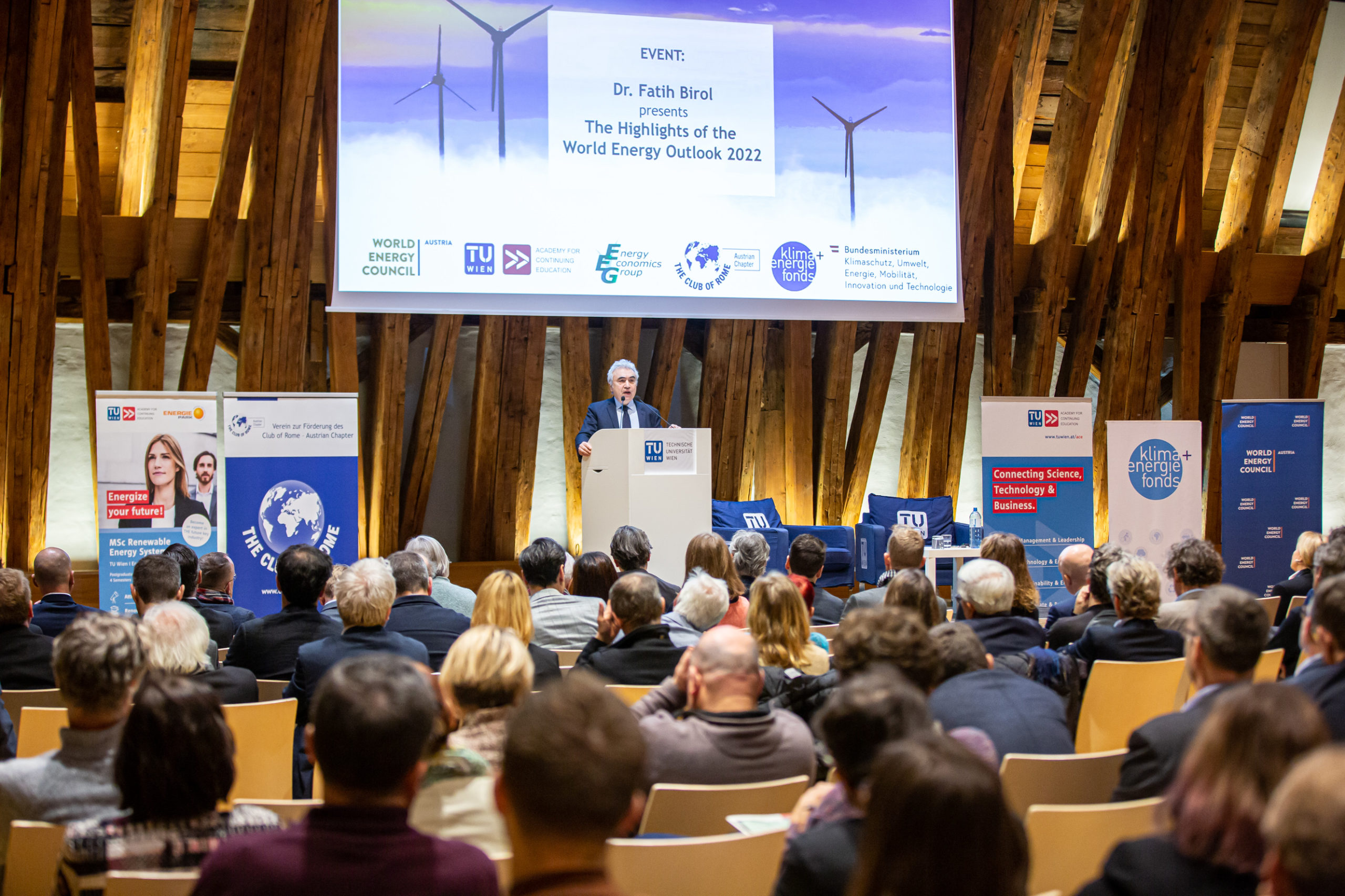 Der diesjährige „World Energy Outlook“ (WEO) wurde heute von Fatih Birol, Exekutivdirektor der Internationalen Energieagentur (IEA), im Kuppelsaal der TU Wien vor knapp 300 Gästen vorgestellt. Der im Oktober veröffentlichte Weltenergieausblick gilt als die maßgeblichste Quelle für Analysen und Prognosen in der Energiewelt. Birol war auf Einladung des Austrian Chapter des Club of Rome, des World Energy Council Austria, der TU Wien, des Klima- und Energiefonds und des Klimaschutzministeriums in Wien zu Gast. Die Veranstaltung wurde von Vizekanzler Werner Kogler in Vertretung von Klimaschutzministerin Leonore Gewessler eröffnet.